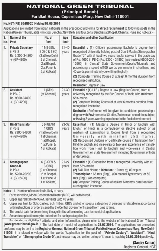 How To Apply: The application on the prescribed proforma may be sent to the Registrar, General National Green Tribunal, Faridkot House., Copernicus Marg, New Delhi-110001 in a closed envelope with the words "Application for the post of "Private Sectary", "Assistant", "Hindi Translator" or "Stenographer Grade-D". as the case may be, written on top of it. so as to reach by 31/07/2014 positively.